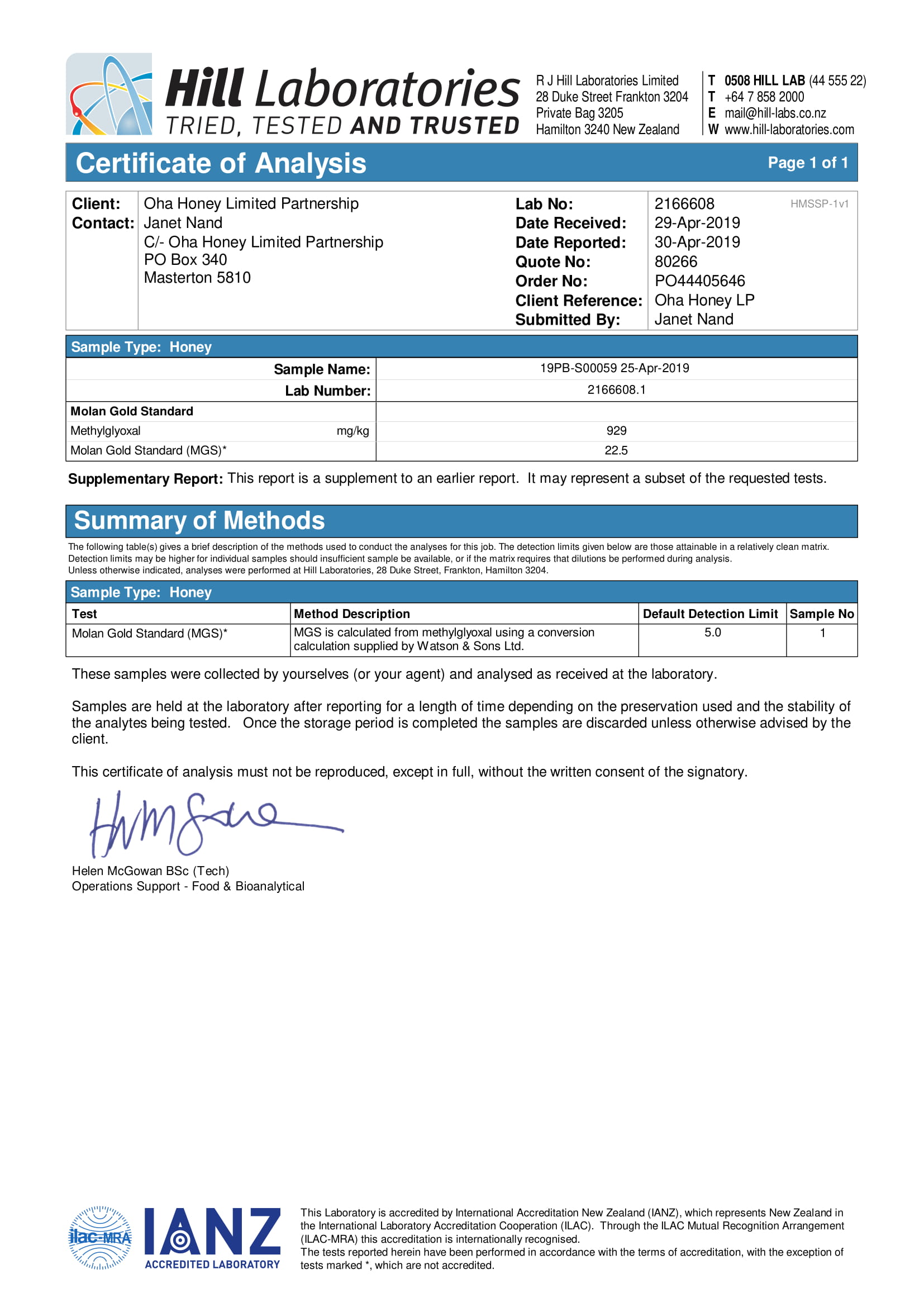 System oznakowywania miodu manuka Molan Gold Standard(MGS) jako podstawę określa faktyczną zawartość dietetycznego methylgyoxalu, który występuję tylko w prawdziwych miodach manuka. Każda partia miodu oznakowana jako Molan Gold Standard(MGS) jest testowana oraz certyfikowana przez akredytowane laboratorium zgodnie z normą ISO 17025.